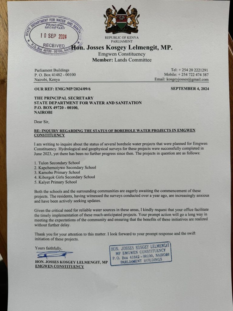 1. Songoliet & Chesuwe Borehole Water Projects – These projects have stalled due to contractual issues, which are now being addressed to ensure work resumes swiftly.