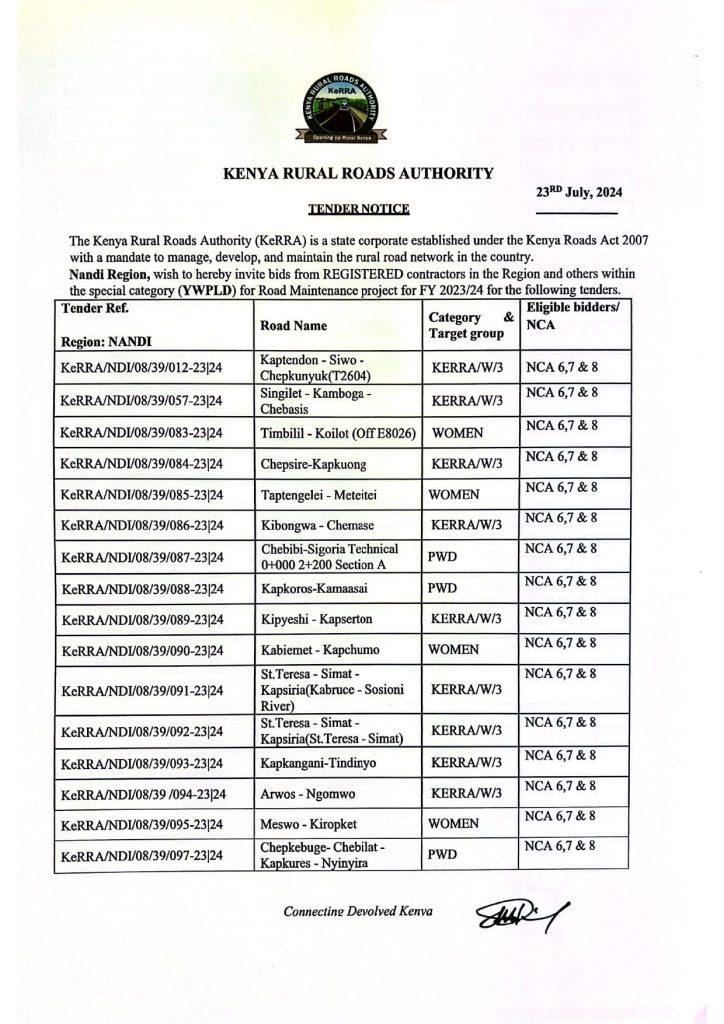 Update: 11 roads in Emgwen Constituency are set for maintenance, currently at the tendering stage under KeRRA. See the attached tender notice for details: